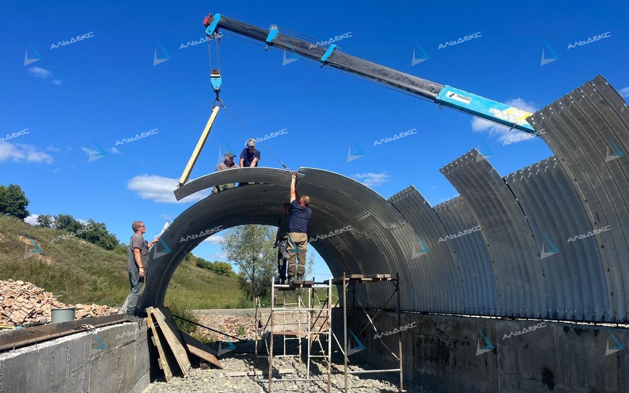 В качестве примера можно рассмотреть установку арки над автомобильной дорогой или железнодорожным полотном. Сначала отдельные листы гофрированной трубы ЛМГ укладываются и стыкуются, формируя замкнутую арочную форму.