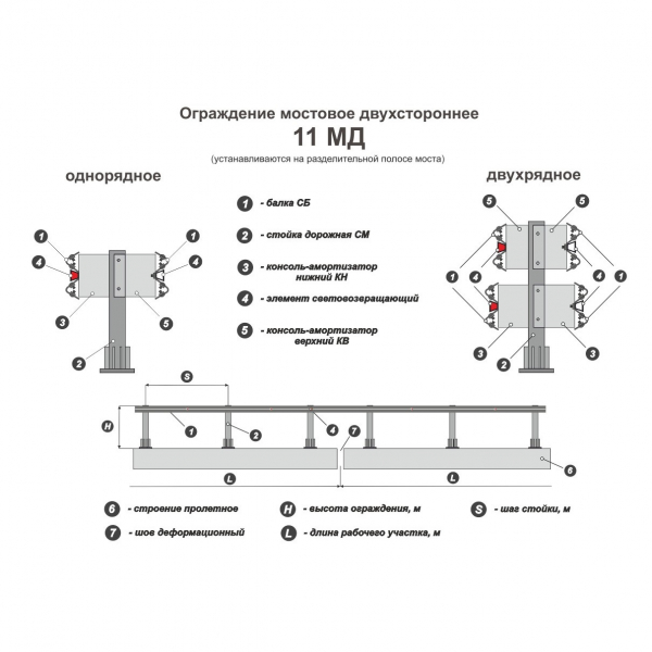 Мостовое ограждение 11МД – мостовое двустороннее барьерное ограждение, назначение которого предотвратить столкновение автотранспортных средств, движущихся во встречных потоках. Двусторонние мостовые ограждения устанавливаются на мостах, эстакадах и подобных конструкциях с несколькими полосами движения. Способствует увличению уровня безопасности транспортных средств и пассажиров.